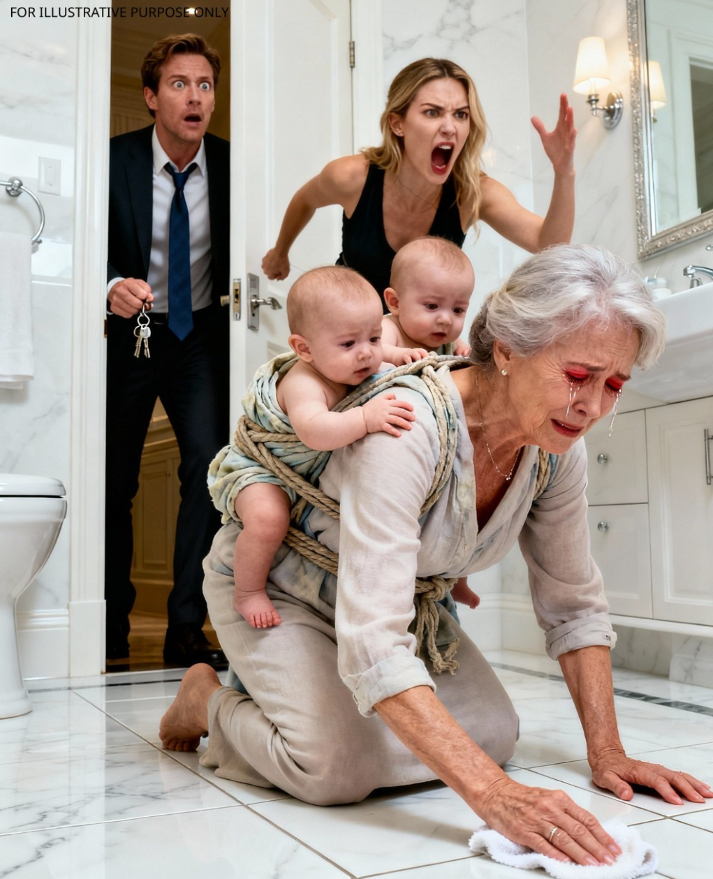 Lauren spojrzała na całą trójkę—swoją teściową klęczącą, własne dzieci przypięte do tych kruchych pleców—z spokojnym, zdystansowanym wyrazem twarzy kogoś, kto ogląda niedziałający mebel.