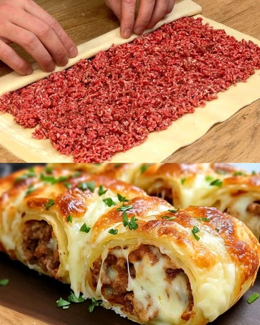 Pikantne ciasto francuskie z mięsem mielonym i serem