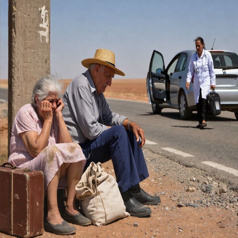 Starszy mężczyzna w słomkowym kapeluszu, otoczony wysłużonymi materiałowymi torbami i małą walizką, która zdawała się widzieć lepsze czasy. Coś w tej scenie ściskało moje serce. Nie było normalne widzieć ludzi w tym wieku pod palącym słońcem bez żadnej ochrony. Zatrzymałem samochód przy senacie i wysiadłem. Kurz wzbił się pod moje kroki, a gdy się zbliżyłem, wyraźnie widziałem ich twarze. Jej oczy były czerwone, a policzki pokryte suchymi łzami.